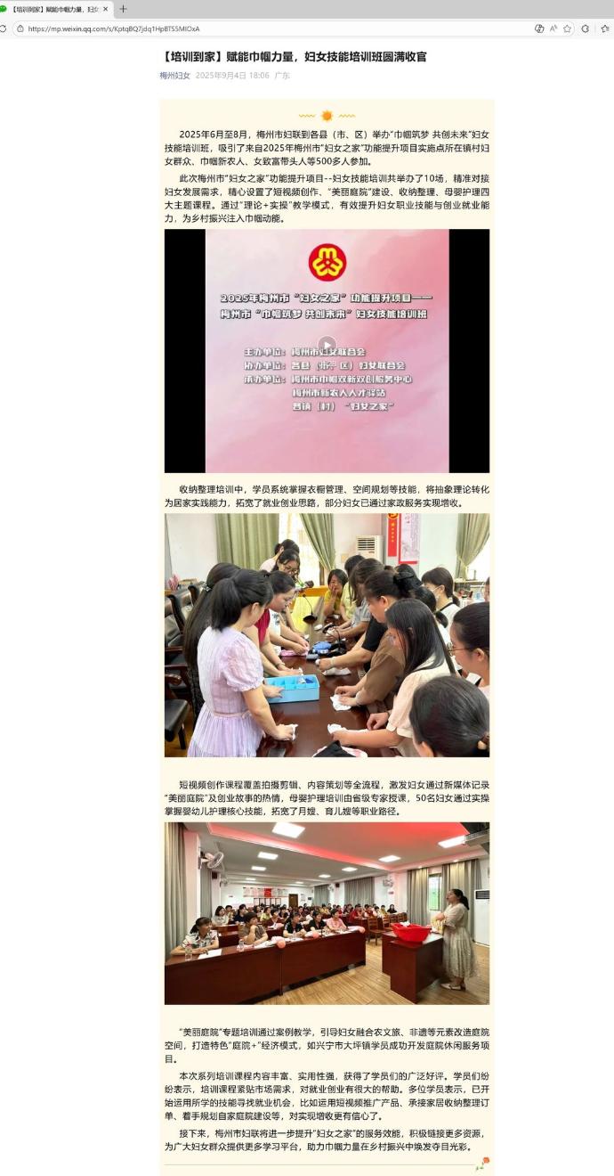 2025年6月至8月,围绕妇女技能提升与“妇女之家”功能建设,梅州市持续推进“巾帼筑梦 共创未来”妇女技能培训系列活动。该系列项目由梅州市妇联统筹部署,在多个县(市、区)分批实施,累计开展培训10场,吸引来自项目实施点所在镇村的妇女群众、巾帼新农人、女致富带头人等500余人参与。