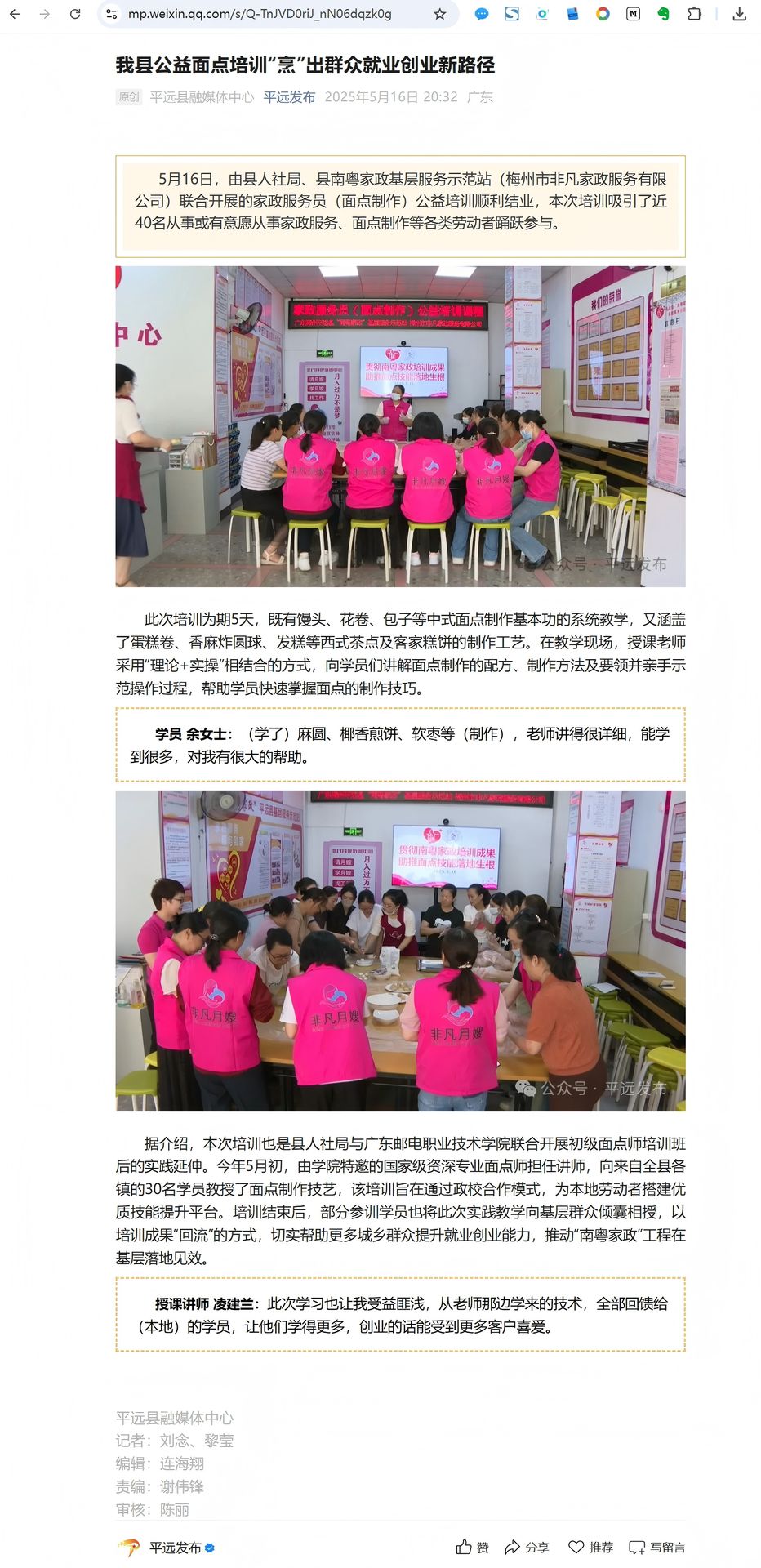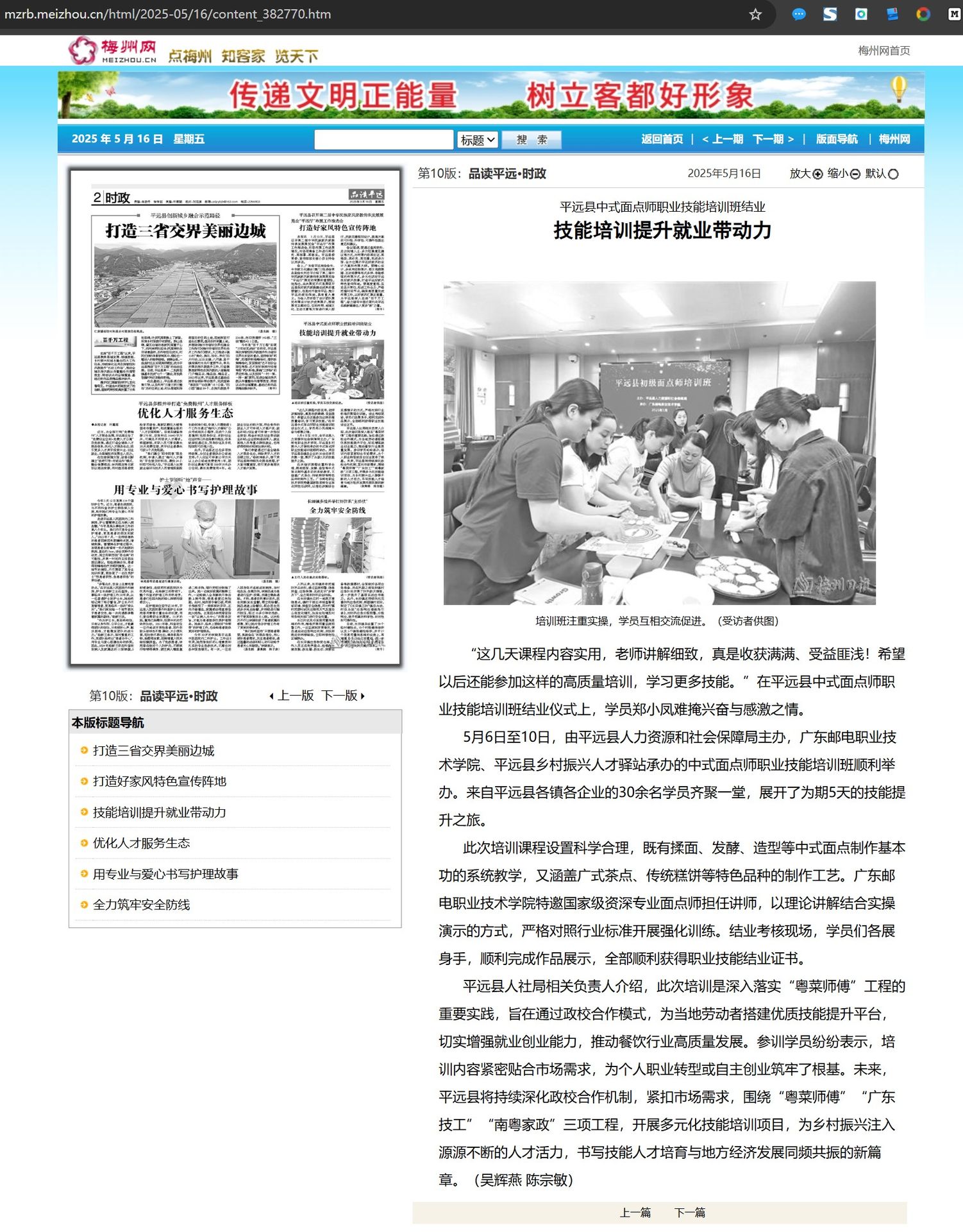 2025年5月,平远县中式面点师职业技能培训及家政服务员(面点制作)公益培训相继开展并顺利完成。该系列培训在政校协同机制下有序推进,围绕技能提升、成果转化和基层共享展开,为技能培训如何更好服务就业创业提供了具有实践意义的样本。